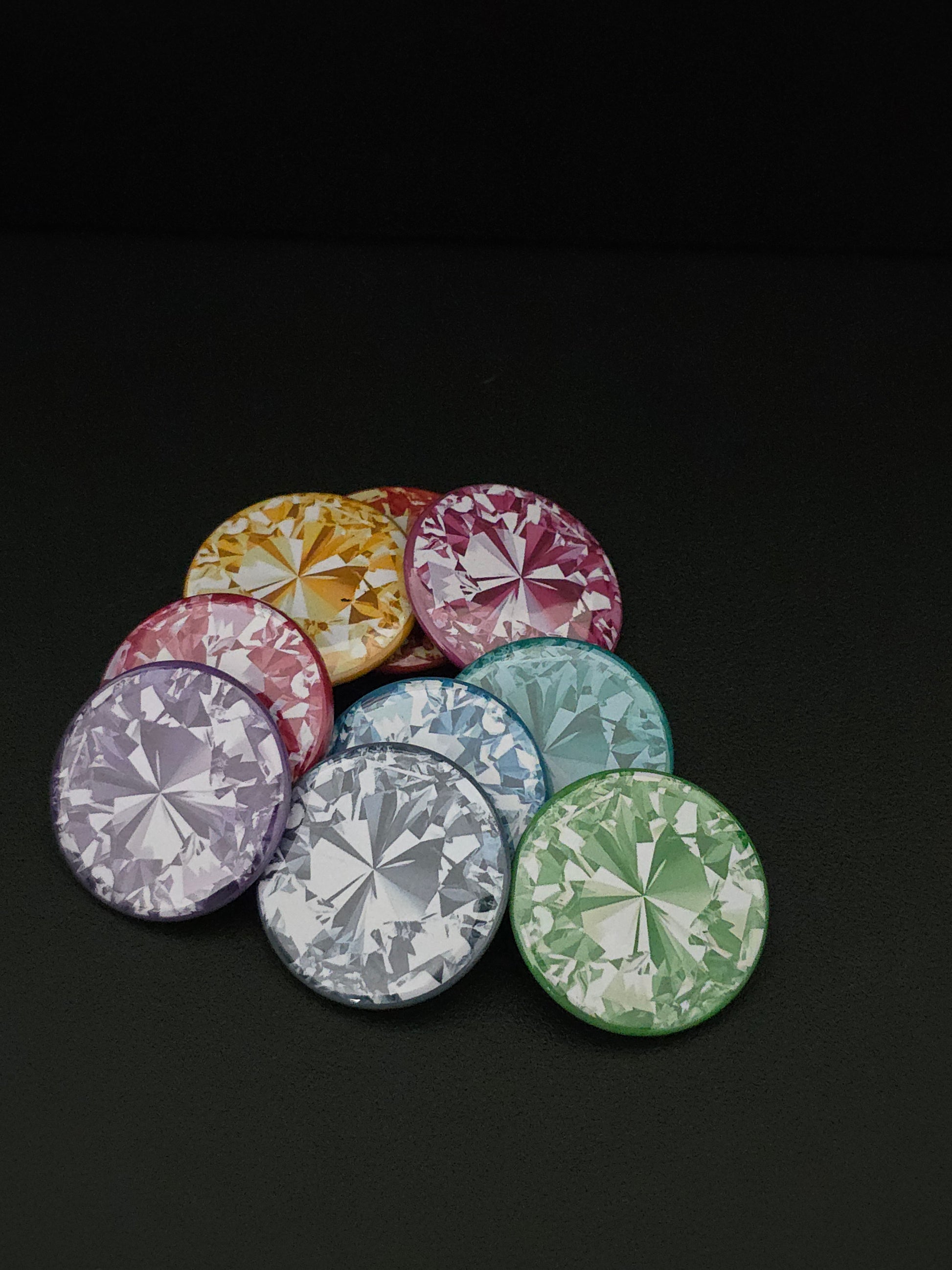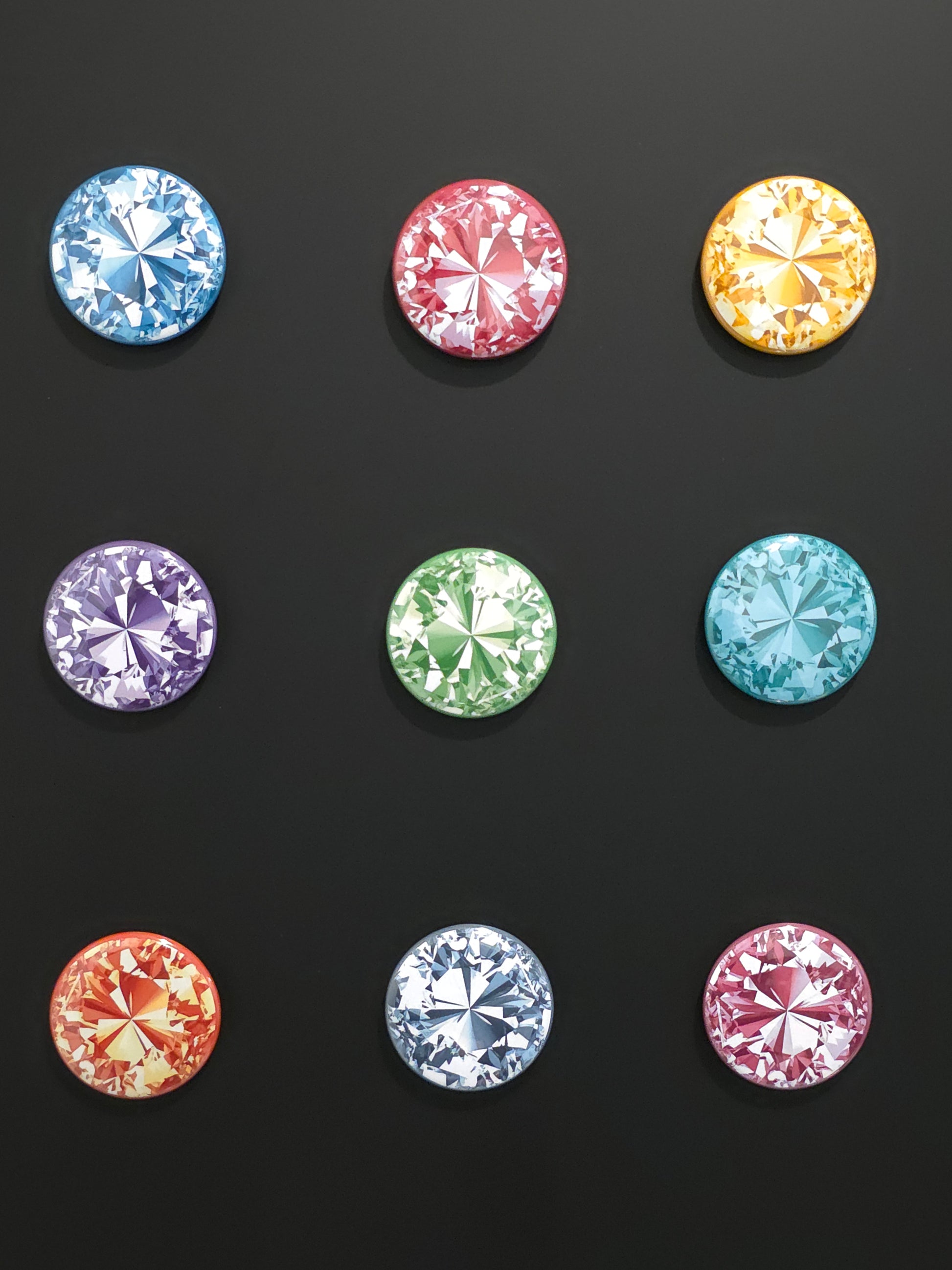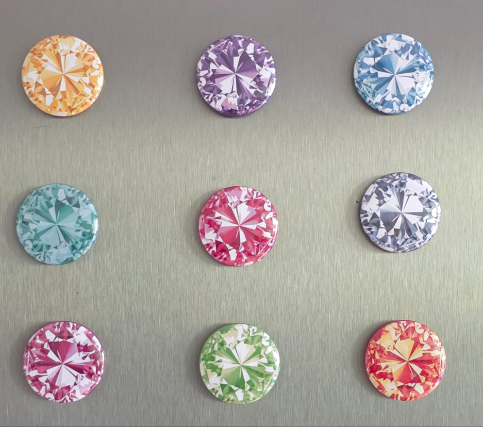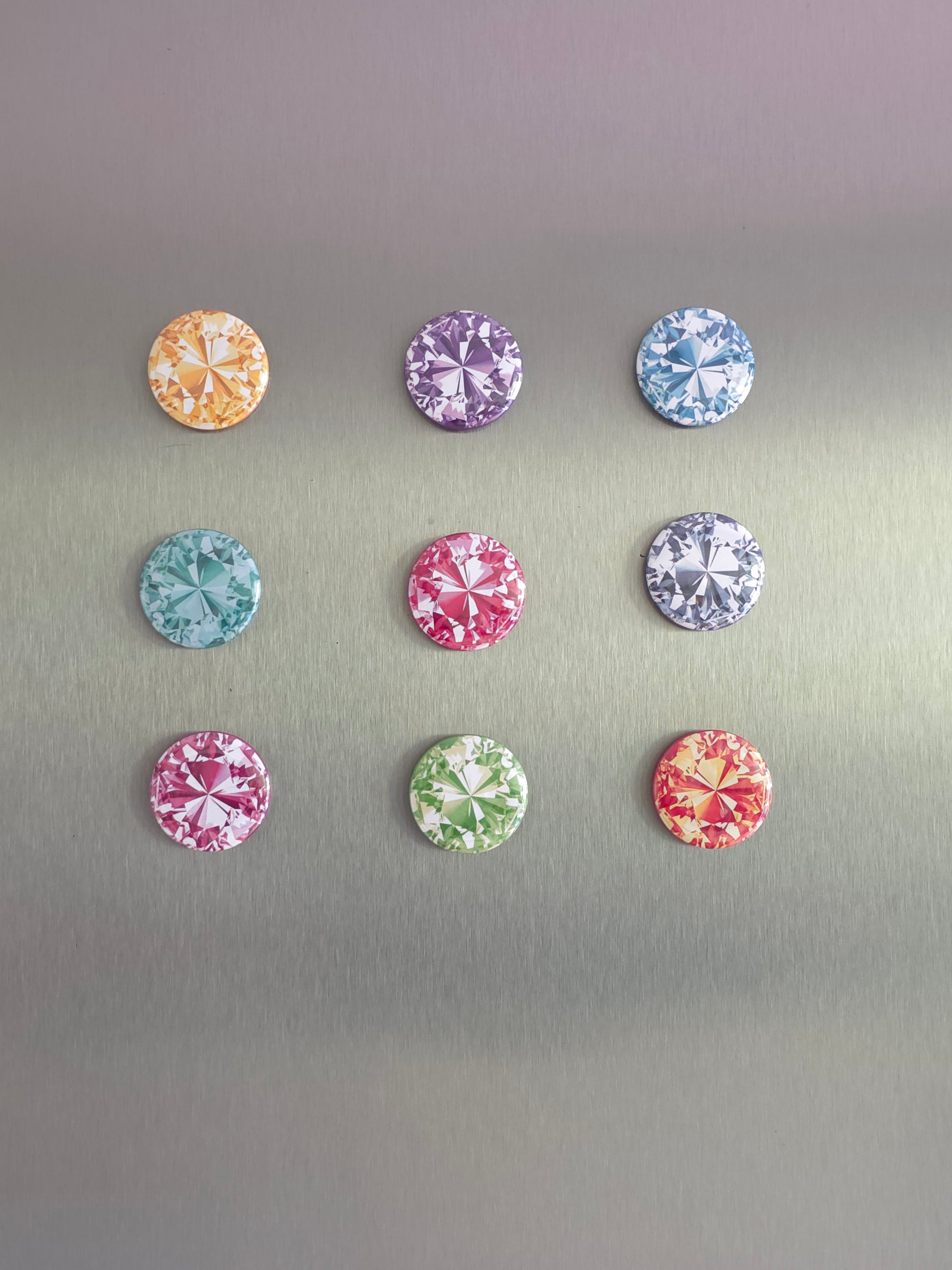 Add a pop of color and sparkle to your space with this stunning set of 9 handcrafted gemstone-style magnets. Each magnet is designed to resemble a radiant cut gem, with bold, vibrant colors and a glossy finish that catches the light beautifully.