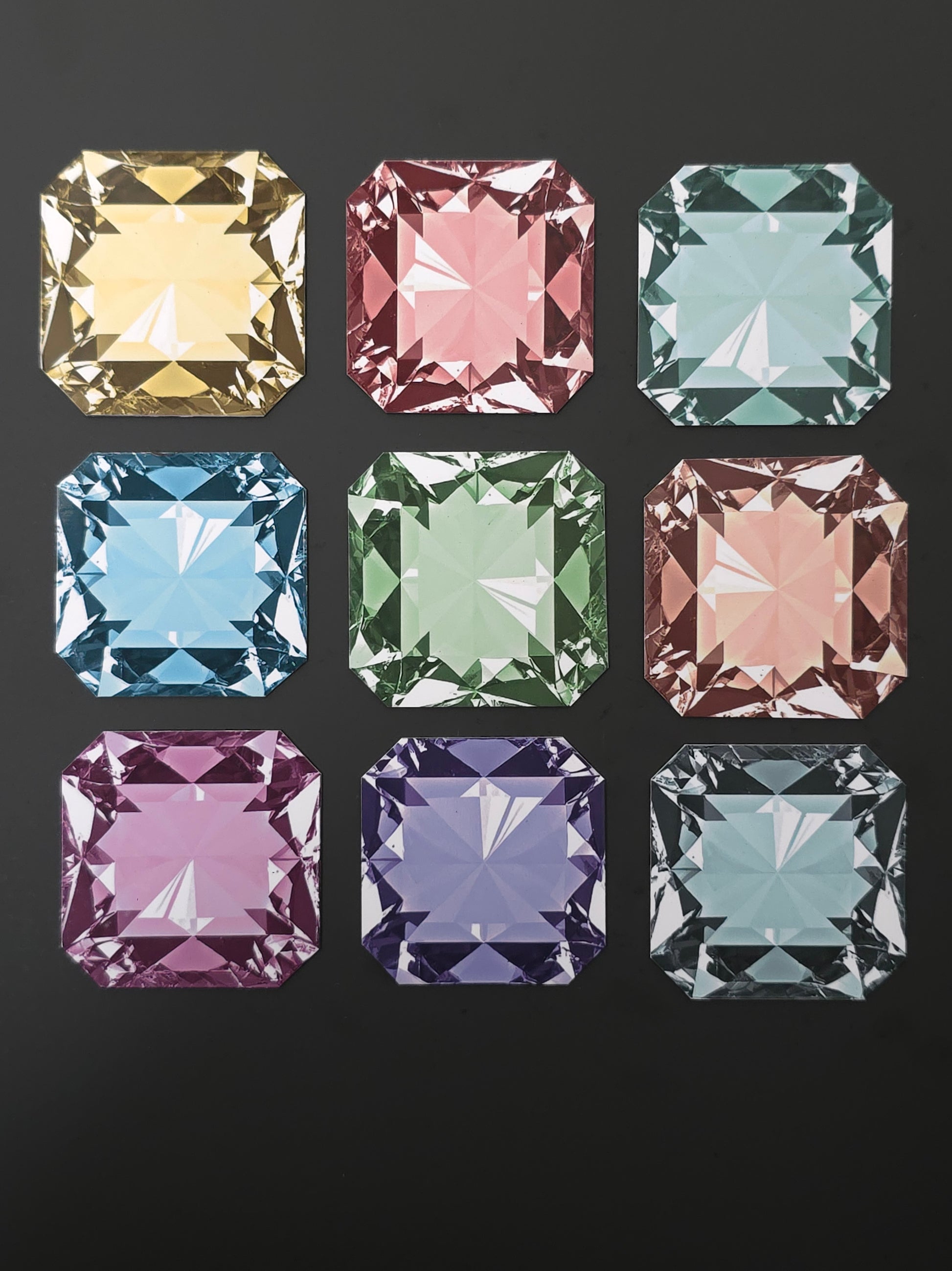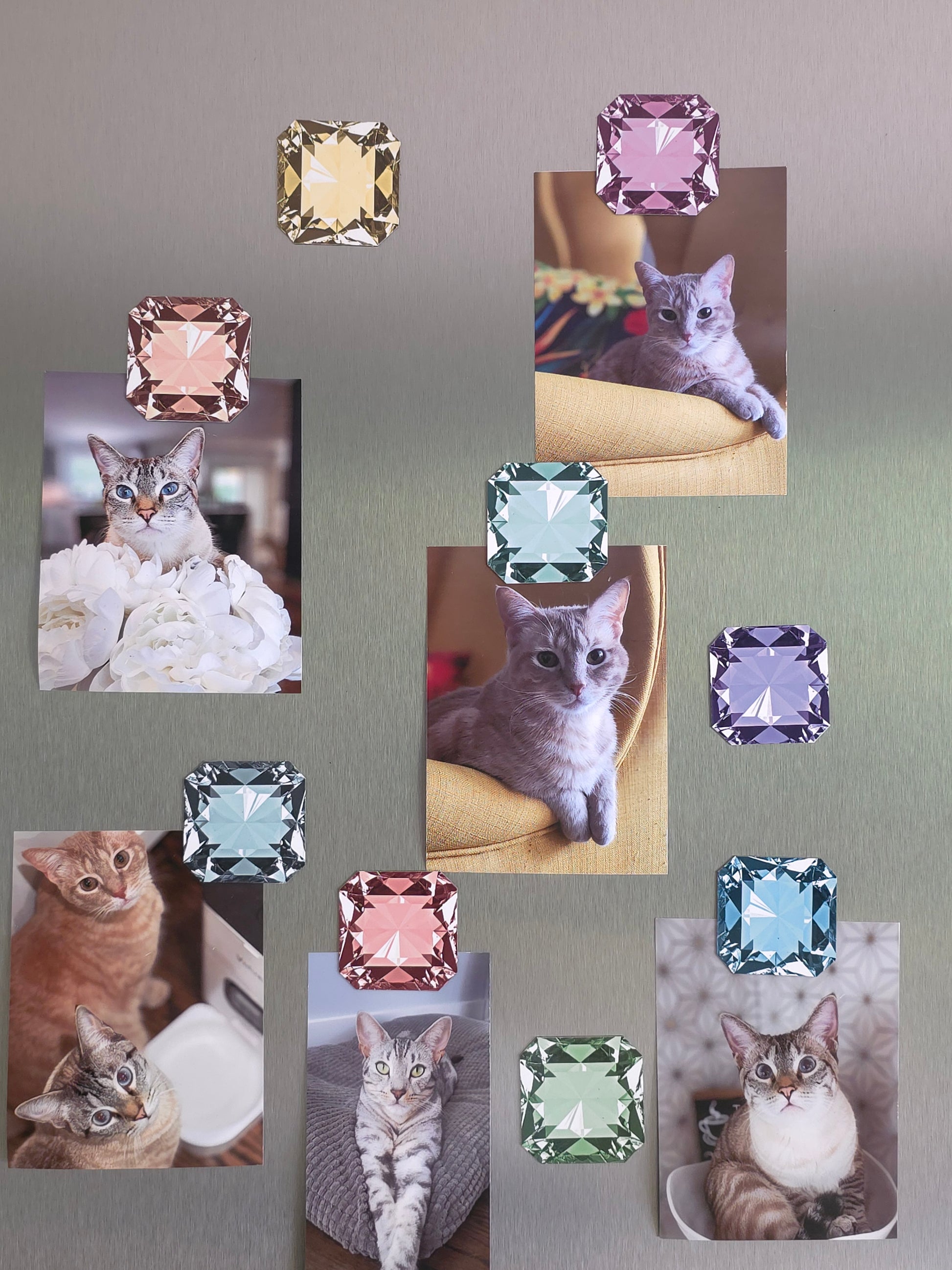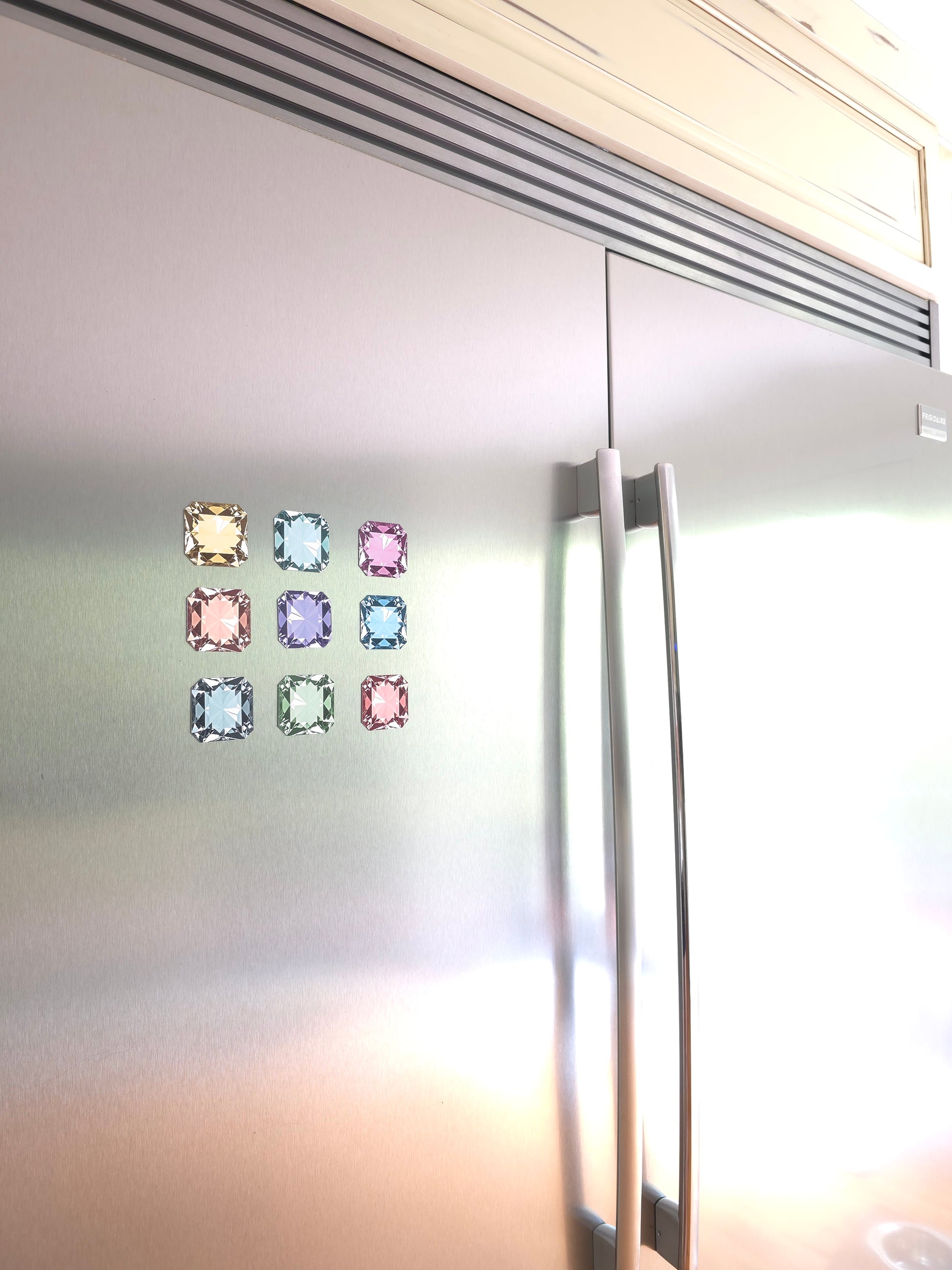 Add a pop of color and sparkle to your space with this stunning set of 9 handcrafted gemstone-style magnets. Each magnet is designed to resemble a radiant-cut gem, with bold, vibrant colors and a glossy finish that catches the light beautifully.